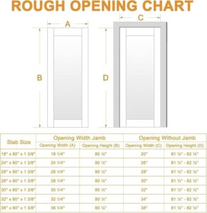 QUALITY MATERIAL: This door slab is made of CARB P2 Certified MDF with PVC film attached to the surface, durable and easy to clean. The solid core effectively isolates noise, ensuring your privacy is well protected. Safe material makes you feel more at ease during use. PRODUCT SIZE: The width of the door panel: 30″, Height: 80″, Thickness: 1.38″, Suitable for door opening size:30-1/4” x 80-1/2”; NOTE: The door opening needs to be slightly larger than the door size. Please measure carefully before purchasing to avoid purchasing the wrong size. PRODUCT INCLUDED:Our product package contains only one door slab. Hardware…